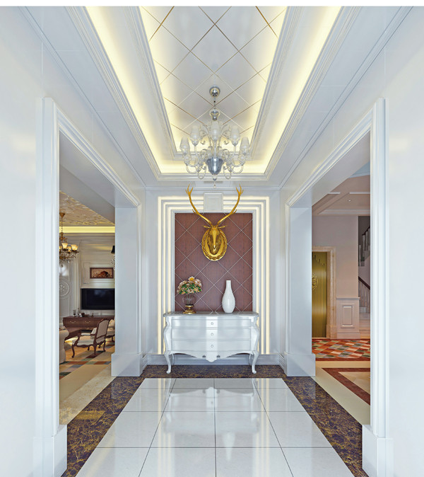 一般室內(nèi)過(guò)道的上方會(huì)有梁,所以我們一般都是選擇有吊頂?shù)奶幚矸绞健5蹴斠撕?jiǎn)潔流程,圖案以能體現(xiàn)韻律和節(jié)奏的線性為主,橫向?yàn)榧选5蹴斠蜔艄獾脑O(shè)計(jì)協(xié)調(diào),頂面盡量用清淺的顏色,不要造成凌亂和壓抑之感。